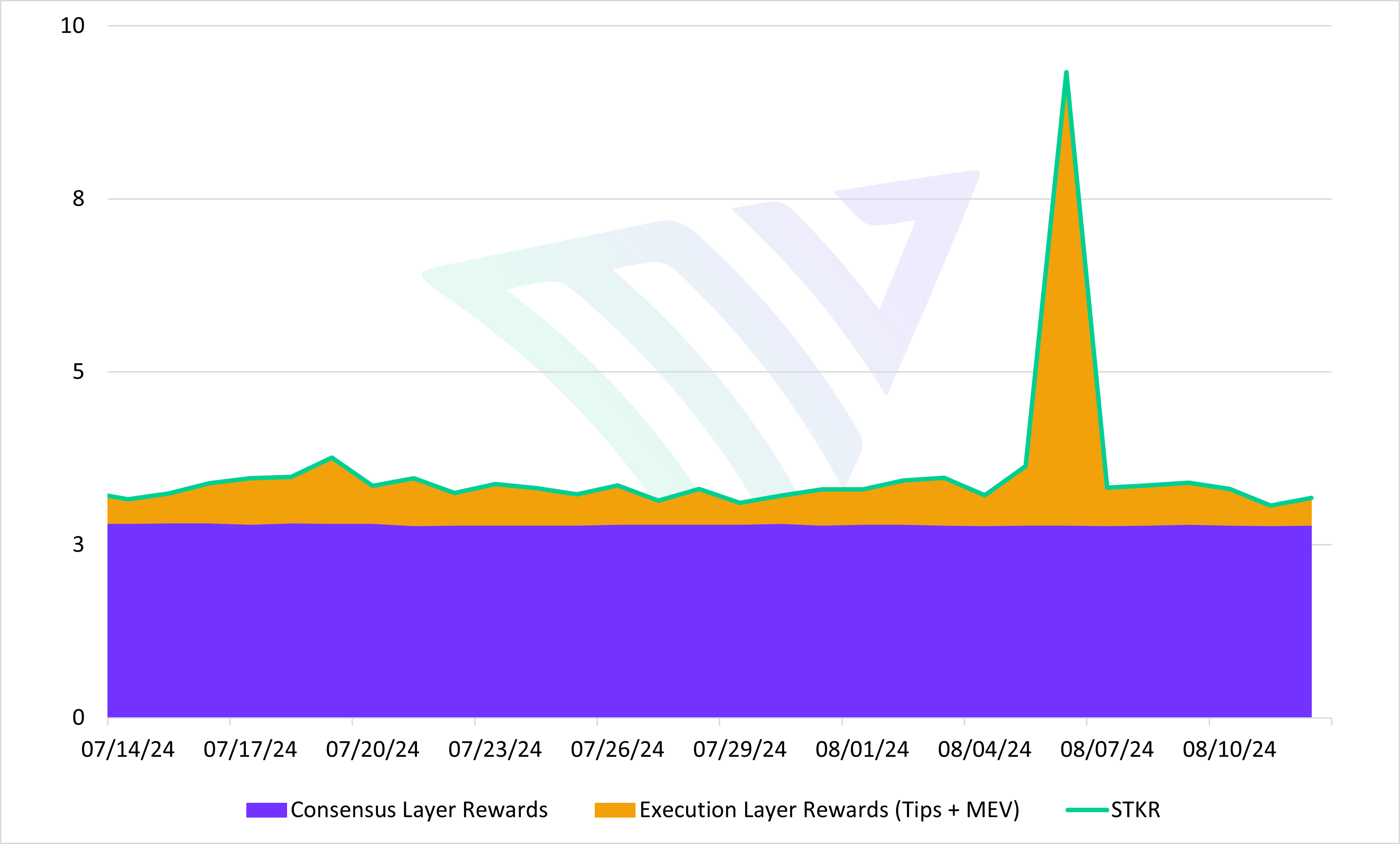 During periods of heightened market activity, MEV and gas tips can significantly exceed Ethereum’s base issuance. Yet, many ETF disclosures and staking benchmarks continue to overlook these execution-layer rewards. The chart below illustrates this dynamic during the Yen-Carry Crash event in August 2024, where extreme crypto market volatility led to a sharp spike in MEV and tips. This resulted in execution-layer rewards comprising a substantially larger share of total staking returns, highlighting the importance of accounting for these components when assessing real-world staking yields.