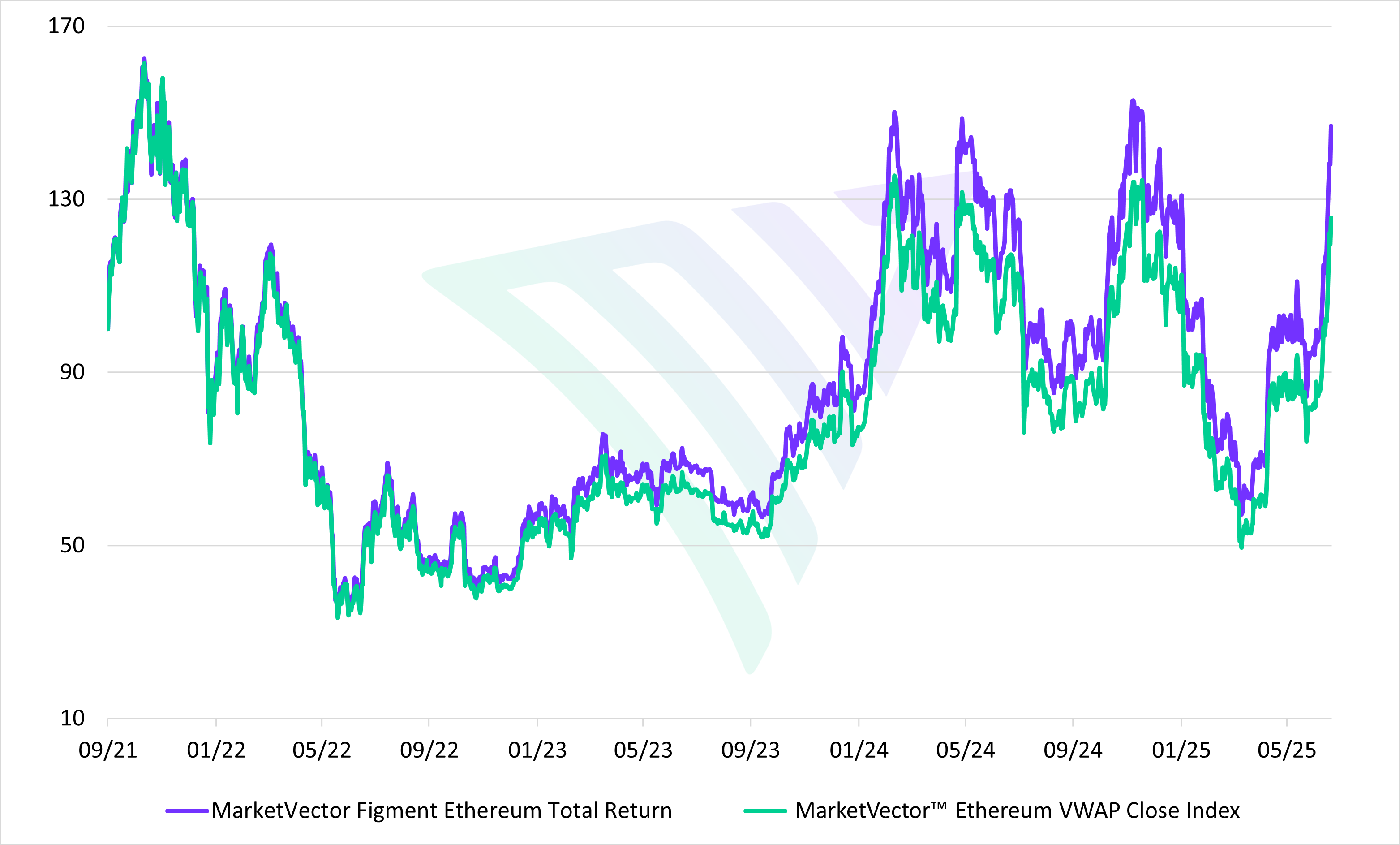 When STKR is combined with an Ethereum price index to produce the MarketVector™ Figment Ethereum Total Return Index (MVETHTR), the result is clear: long-term outperformance that reflects both price and staking yield.